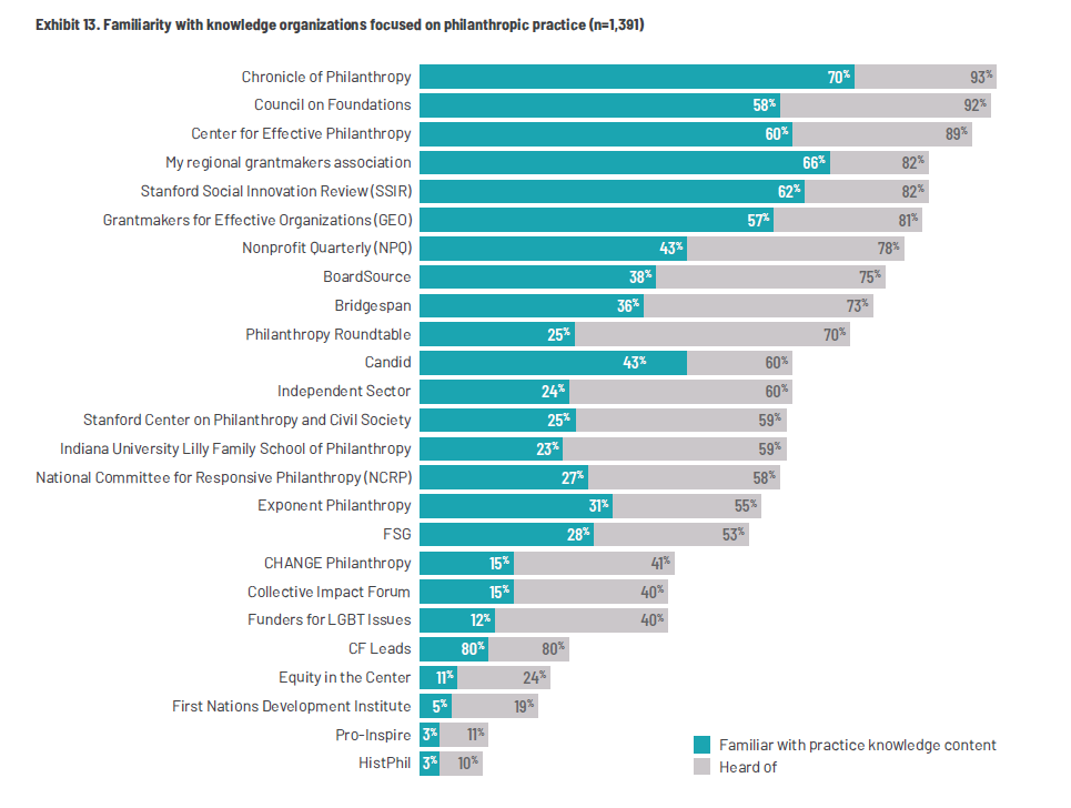 The survey asked respondents to select any of 12 main knowledge sources, and funders selected an average of six—including peers and five others. Nearly two-thirds of funders report relying on digital media, conference sessions, newsletters, and grantee interactions.